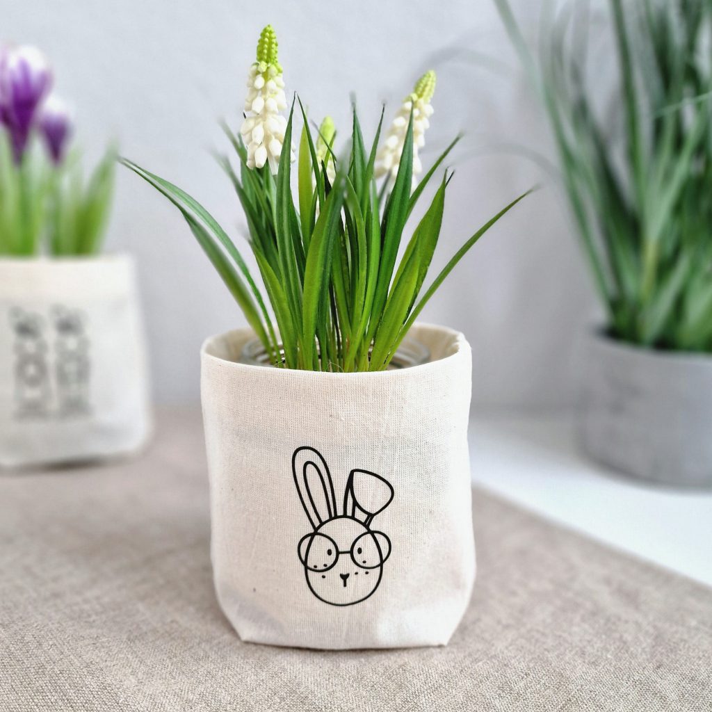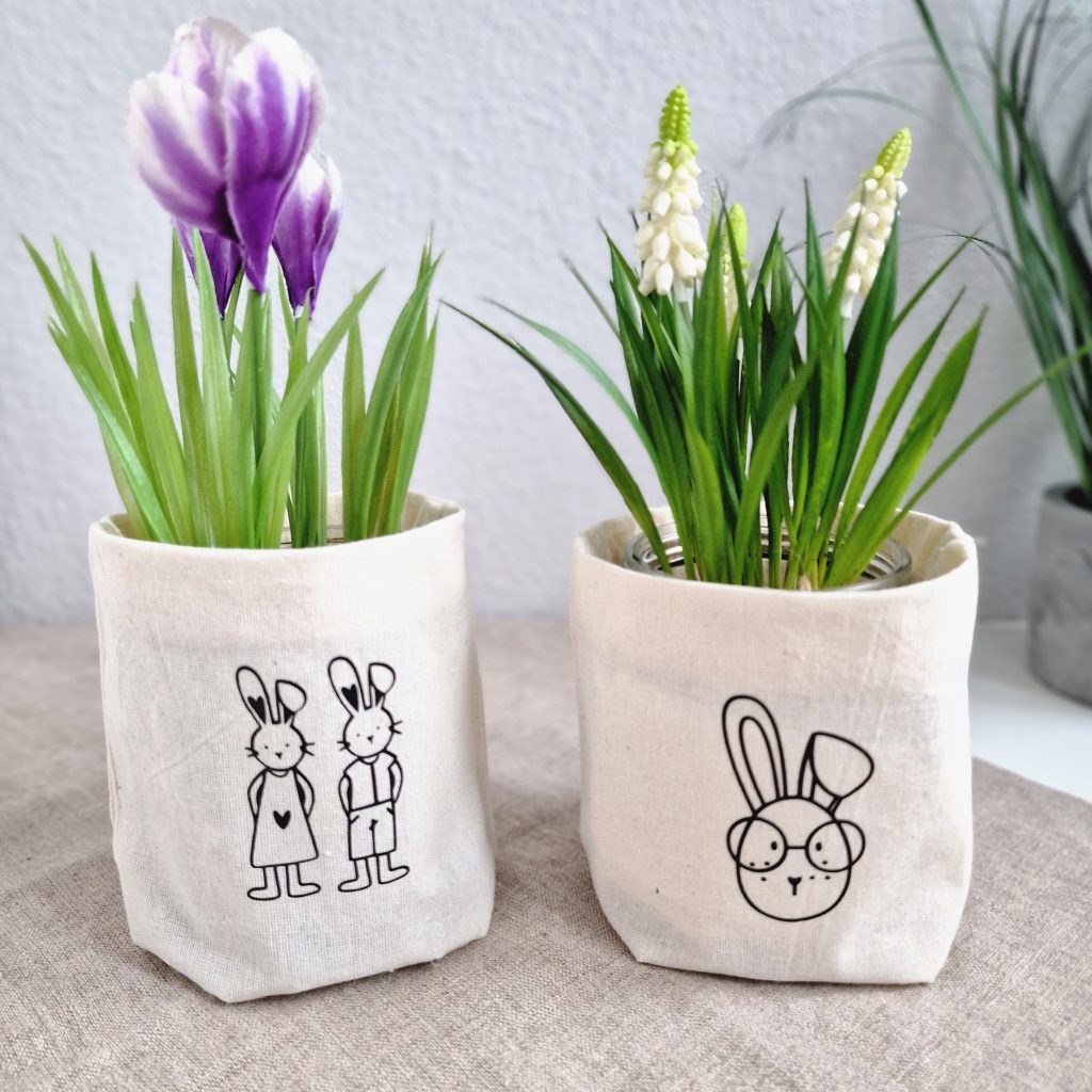 Für die Osterzeit haben wir Gläser mit kleinen Stoffbeuteln überzogen, die wir vorher mit unseren Ostermotiven beplottet haben. Die Gläser kann man dann schön mit Frühlingsblumen bepflanzen oder wie wir mit Deko-Pflanzen dekorieren.