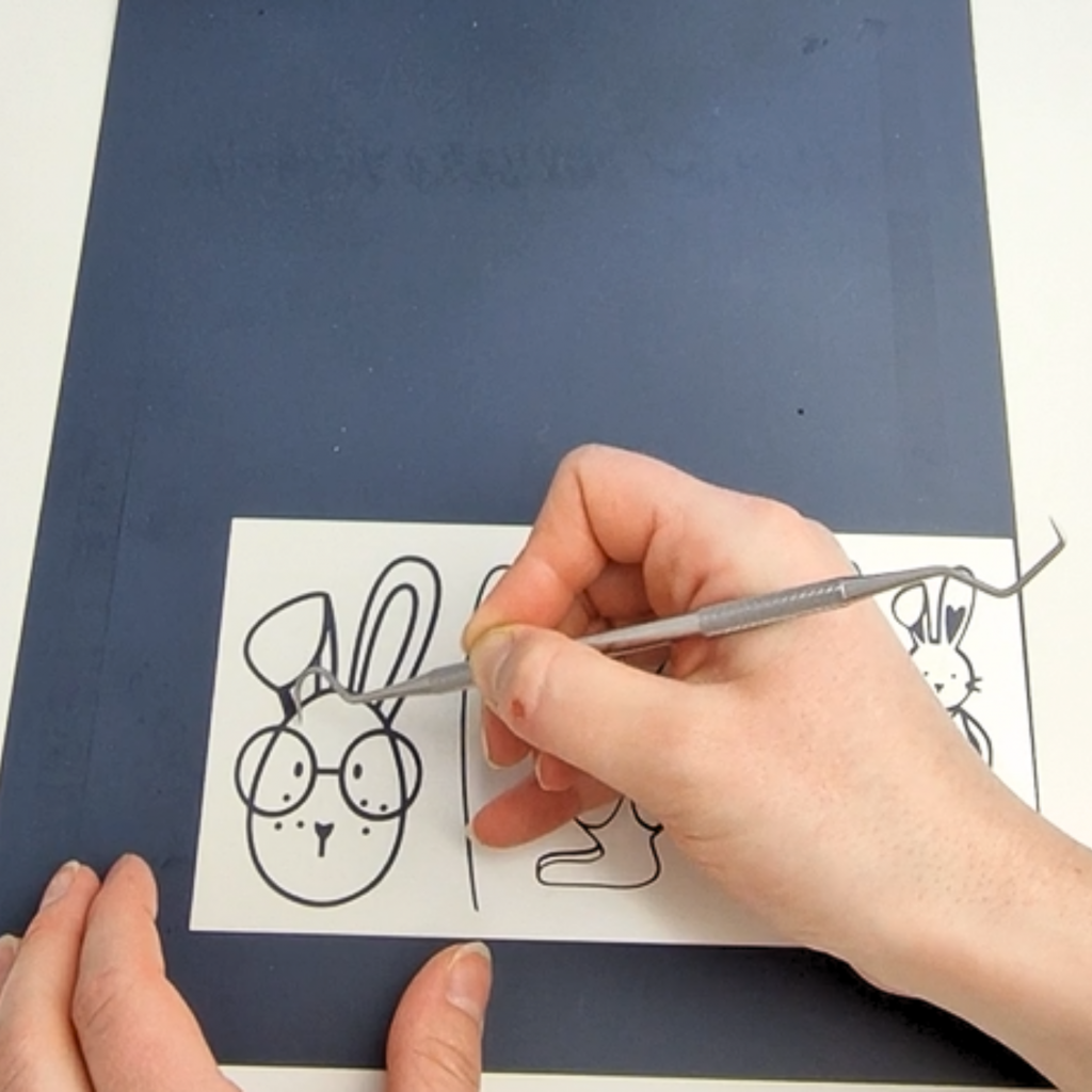 4. Nun lässt du das Plottermotiv von deinem Plotter schneiden. Dafür wird die glänzende Seite der Folie auf die Schneidematte geklebt und das Motiv in der Plotter-Software gespiegelt. Wenn der Plotter fertig ist, muss das Motiv noch entgittert werden, das heißt, dass du alle Folienteile, die nicht zum Motiv gehören, entfernst.