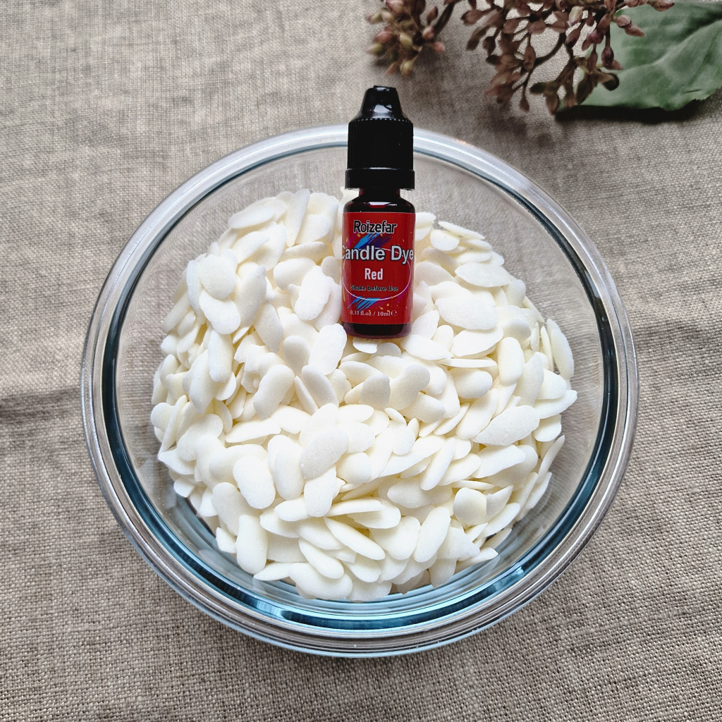 - Das Wachs wird im Schmelztopf oder im Wasserbad erhitzt bis es vollständig geschmolzen ist. Wenn du magst, kannst du das Wachs mit Kerzenfarbe einfärben. Wir haben ein paar Tropfen rote Kerzenfarbe verwendet, um die rosa Wachsfarbe zu erhalten.