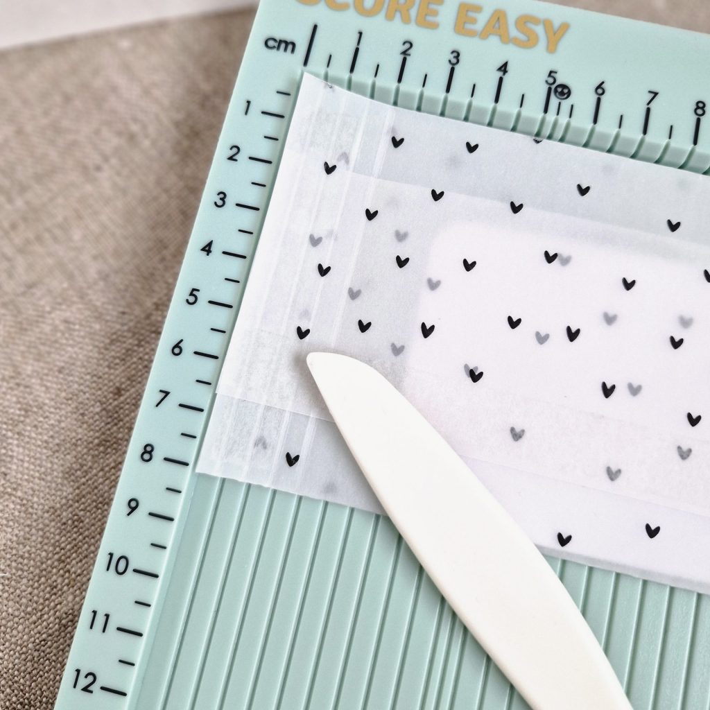 3. Anschließend klebst du das schmale doppelseitige Klebeband auf die Rückseite des Transparentpapiers. Der Rand einer kurzen Seite wird auf der ganzen Länge mit Klebeband versehen und auf den langen Seiten des Transparentpapiers klebst du das Klebeband beidseits nur zwischen den Falzungen.